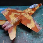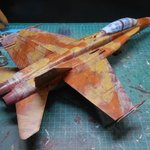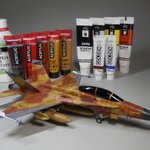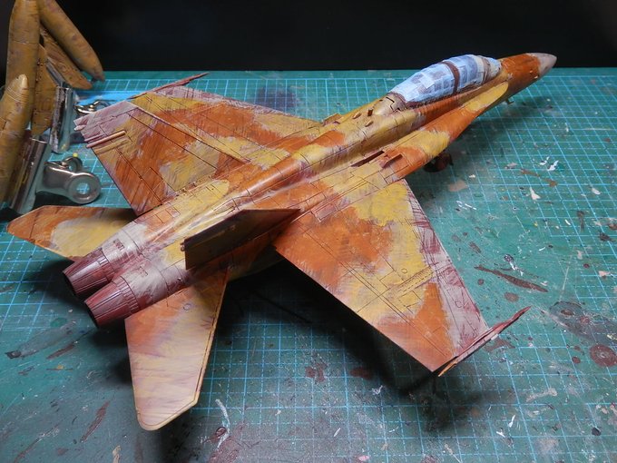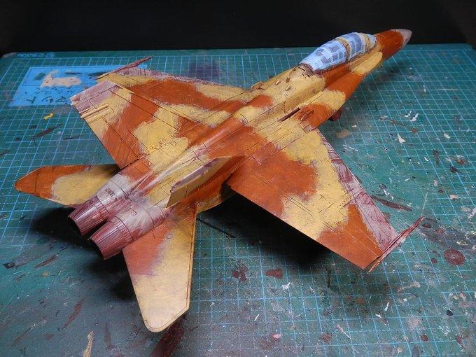 #アクリル絵の具で模型塗装 #水100塗装 がさがさに仕上がる水溶きアクリルの上にアクリル絵の具を重ねると、しっとり落ち着いた半ツヤに仕上がります。 この硬質感が軍用ジェットやAFVによく似合う。 これがやりたくて塗ってます。