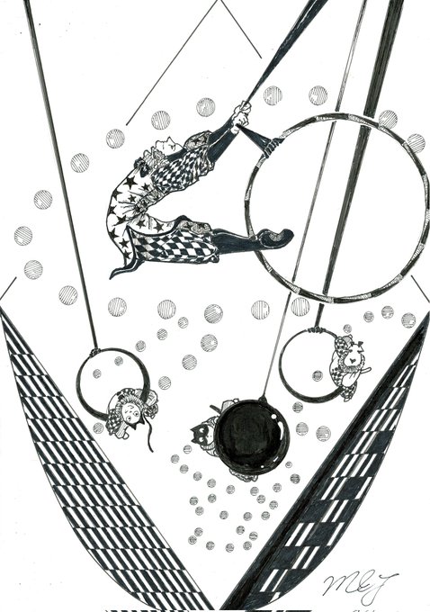 🎈エアリアルリングと鉄球を使った、アクロバティックショータイム🎉 by 🎪🃏😸😺🐶《道化師と陽気な仲間たち》 #アトリエの系譜S #道化師と陽気な仲間たち #アナログ #モノクローム #オリジナルキャラクター #挿絵 #picturebookartwork #mangastyleartwork #アクロバット #エアリアルリング