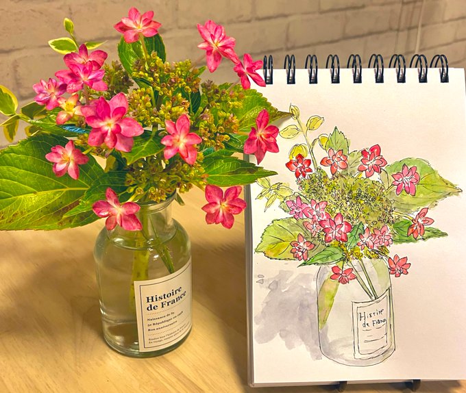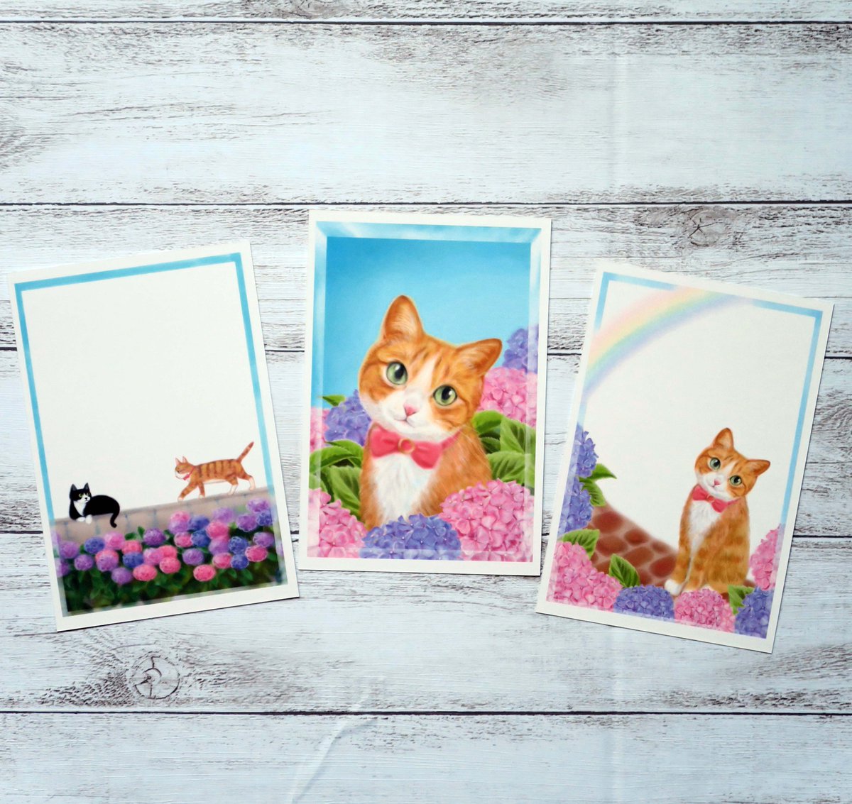 紫陽花の季節になりました😺💗 道端を通りがかっても色とりどりのこんもりした花を目にするようになりましたね💕 minne.com/items/32610029 #minne #minneで販売中 #猫 #猫好きさんと繋がりたい #猫イラスト #アジサイ #ポストカード