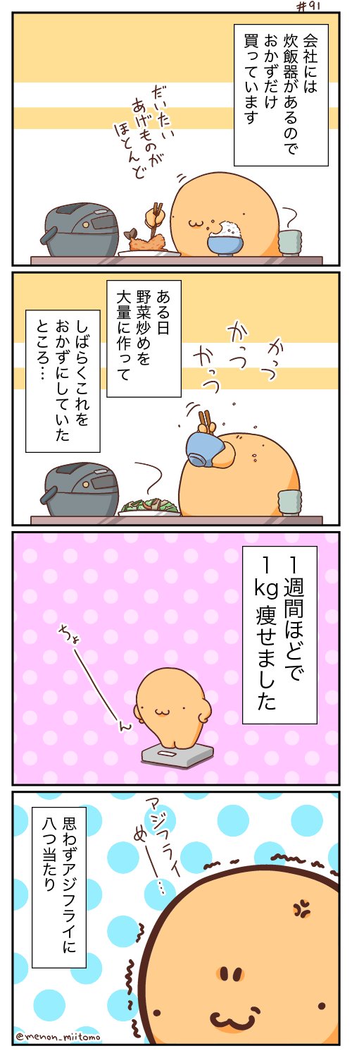 ついでにご飯の量も少し減らしたのが功を奏したのかもしれませんが、やったぜ1kg減! …ということは今まで単純に食べ過ぎていたということだろうか?ショック!!! 今までの作品はこちらから→ameblo.jp/menon-blog/ #アジフライ #4コマ #漫画が読めるハッシュタグ