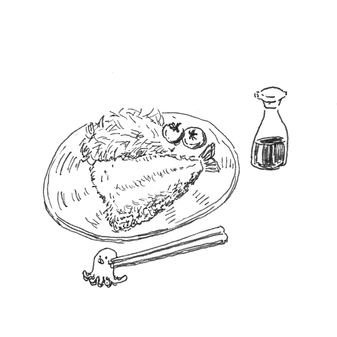 本日描いたのは、 「飽きないアジフライ」でした。 お買い上げありがとうございました。 また次回お会いしましょう。 おやすみなさい。 #ちっちゃめ絵 #絵 #イラスト #illustration #食べもの #アジフライ #はらぺこめがねの直売所