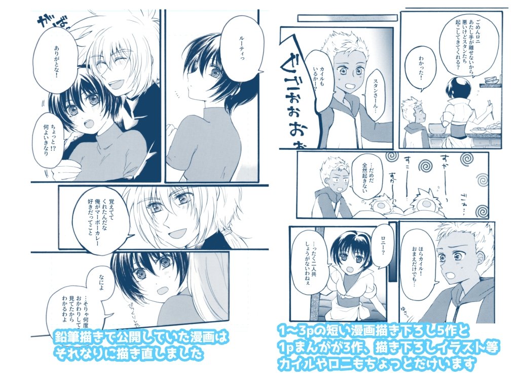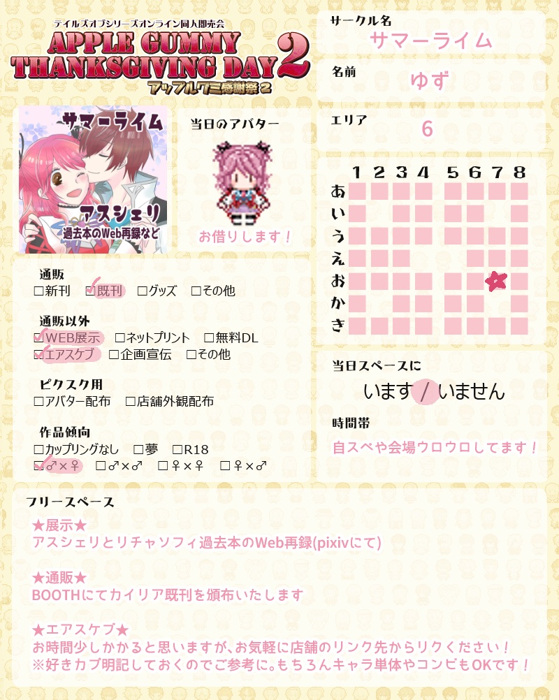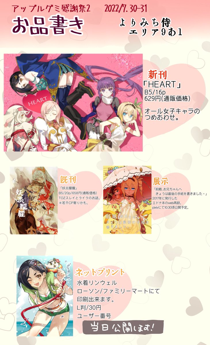 7月30日にあるアップルグミ感謝祭2のサークルカットと大体の展示物ですー! ヴェイグ中心のイラスト本とサレヴェイ・TORの過去絵展示予定 よかったら遊びに来てくださいね〜 #アップルグミ感謝祭2