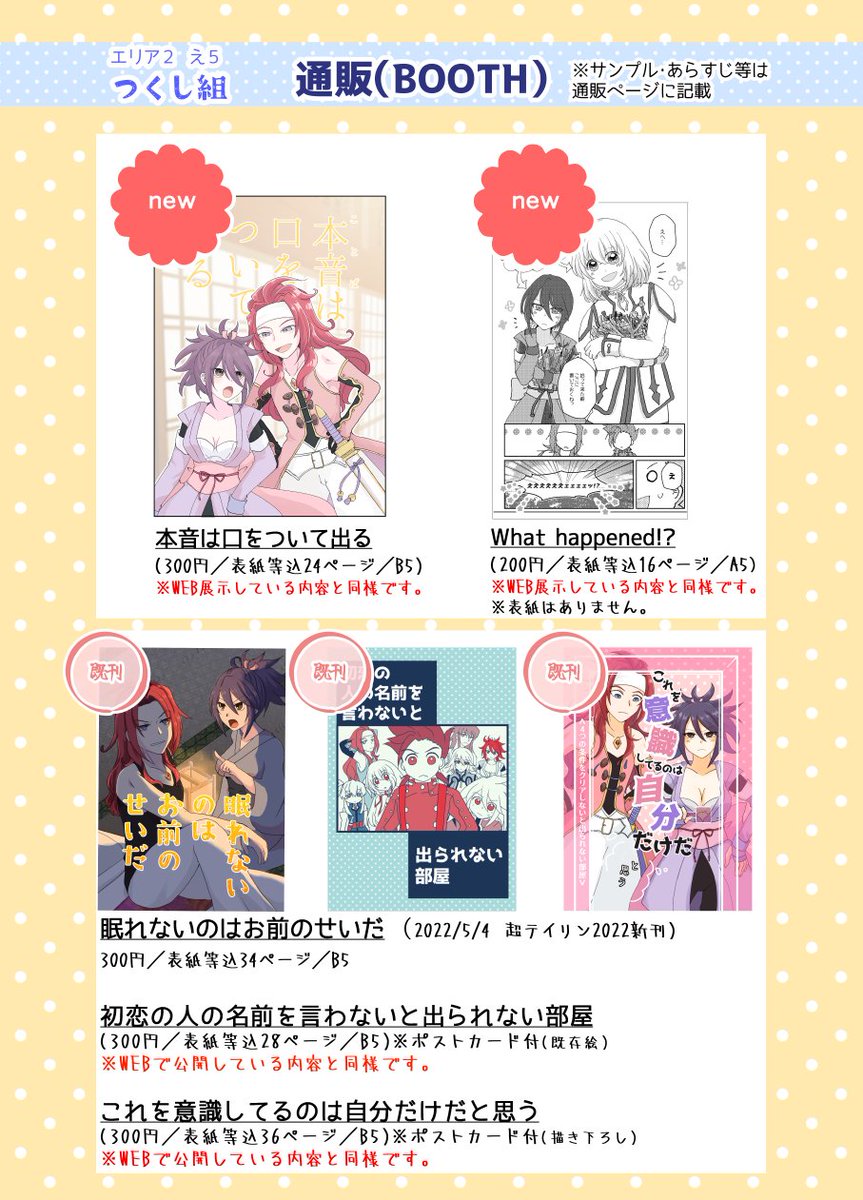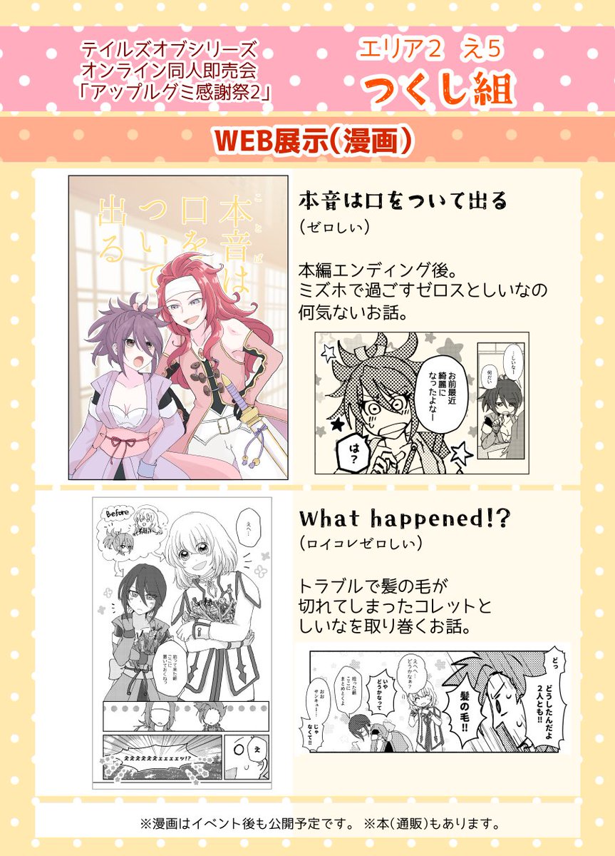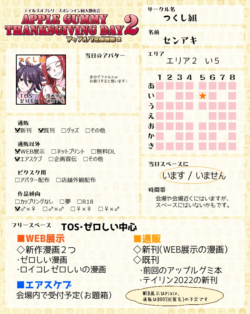 《告知》7/3開催アップルグミ感謝祭2のサークルカード(テンプレお借りしました!)&おしながきです🙇 【エリア2 い5】つくし組 TOS/ゼロしい漫画のWEB展示&頒布します。 展示・通販・エアスケブのURLはイベント当日店舗に貼ります。 よろしくお願いいたします!! #アップルグミ感謝祭2
