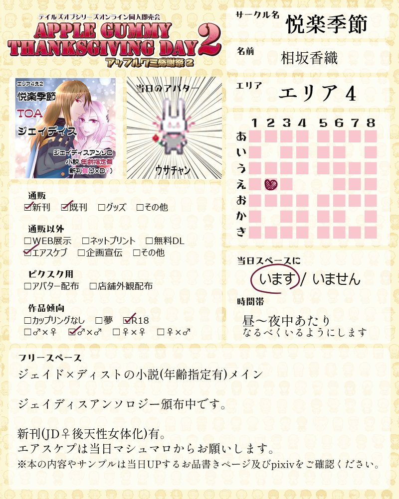 7/30 🍎グミ感謝祭2 サークルカードお借りしましたー エリア4え2 悦楽季節 です^ ジェイディスメインです。 新刊(JD♀)ありますー 5月のテイリン2022発行ジェイディスアンソロもあります。 新刊サンプル等はツリーに。 当日はよろしくお願いいたします! #アップルグミ感謝祭2