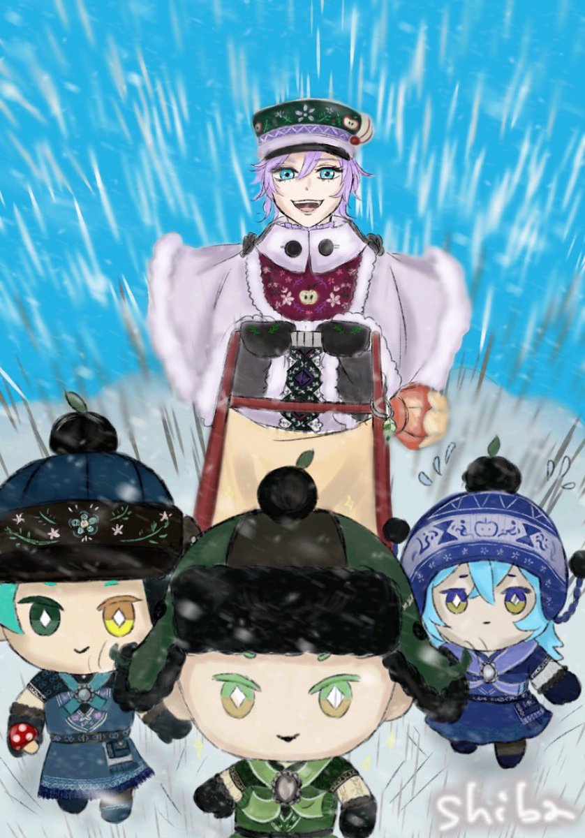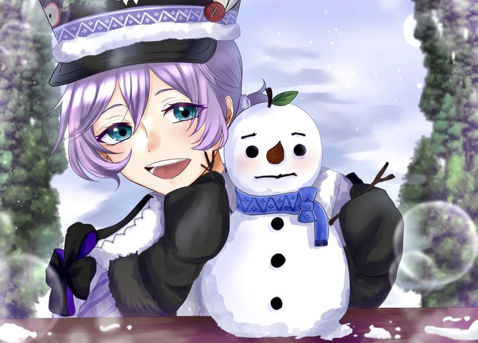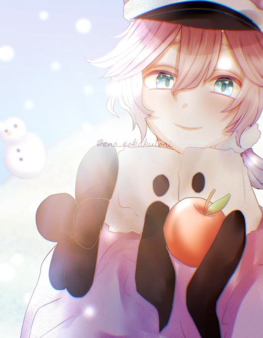 こんばんは⭐️ 今のイベント、🍎豊作村のケルッカロト❄️🛷が始まったので、私の監督生ちゃんも、豊作村の衣装へ✨ 豊作村のエペルくんのお家の前にて、グリムと雪だるまと⛄️🎶 【撮影:エペルくん🍎】 #ツイステ #twst #ツイステファンアート #twstファンアート #twstプラス #豊作村 #アップルボア