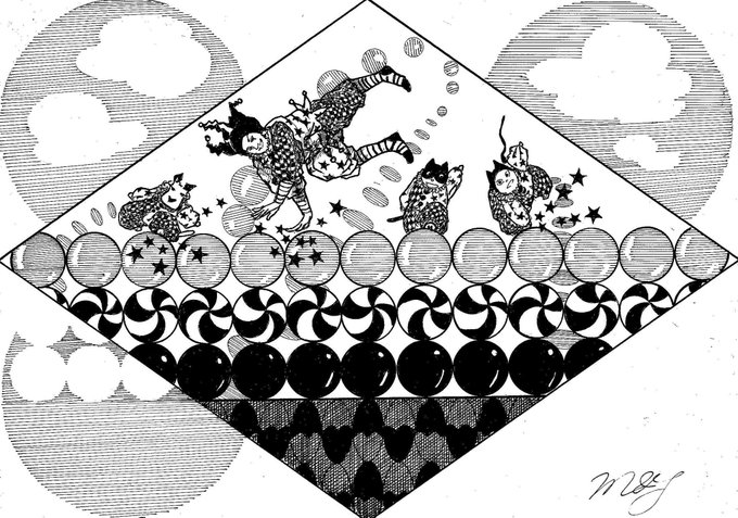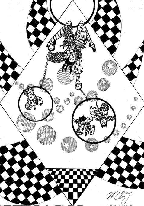 🎪🃏😺😸🐶《道化師と陽気な仲間たち》 🃏😺😸🐶「💗こんにちは 💗皆さん! 今、そっちへ行くからね!!💞」 #道化師と陽気な仲間たち #アトリエの系譜N #道化師 #猫 #犬 #マンガスタイルイラスト #アナログ #モノクローム #道化師オリジナルキャラクター #ペン画 #こんにちは