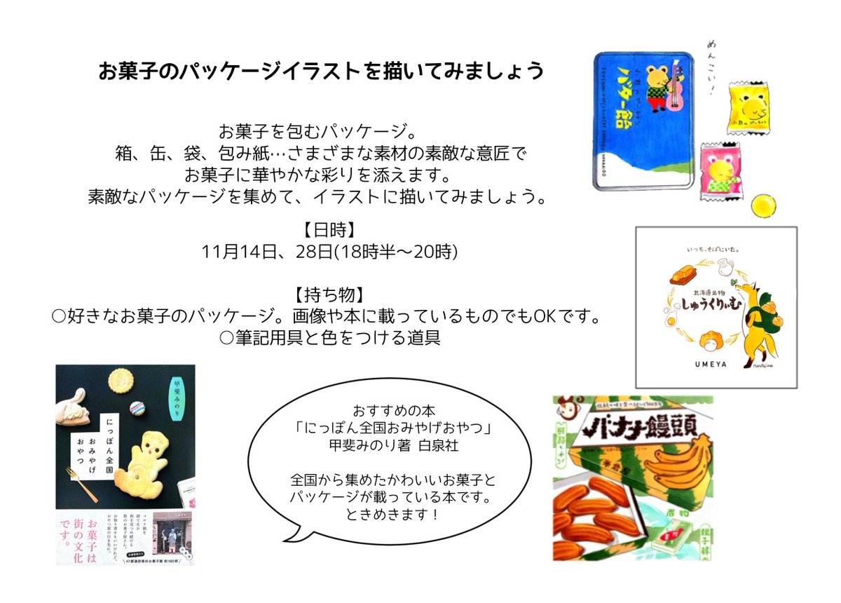 11月14日・28日(月)(18時半-20時)開講の #アナログイラスト入門 は「お菓子のパッケージイラスト」がテーマ。見学や体験もお気軽にどうぞ。お申し込みお問い合わせはNHK文化センター札幌教室までお願い申し上げます☕️ @nhkcul_sapporo #イラスト #アナログイラスト