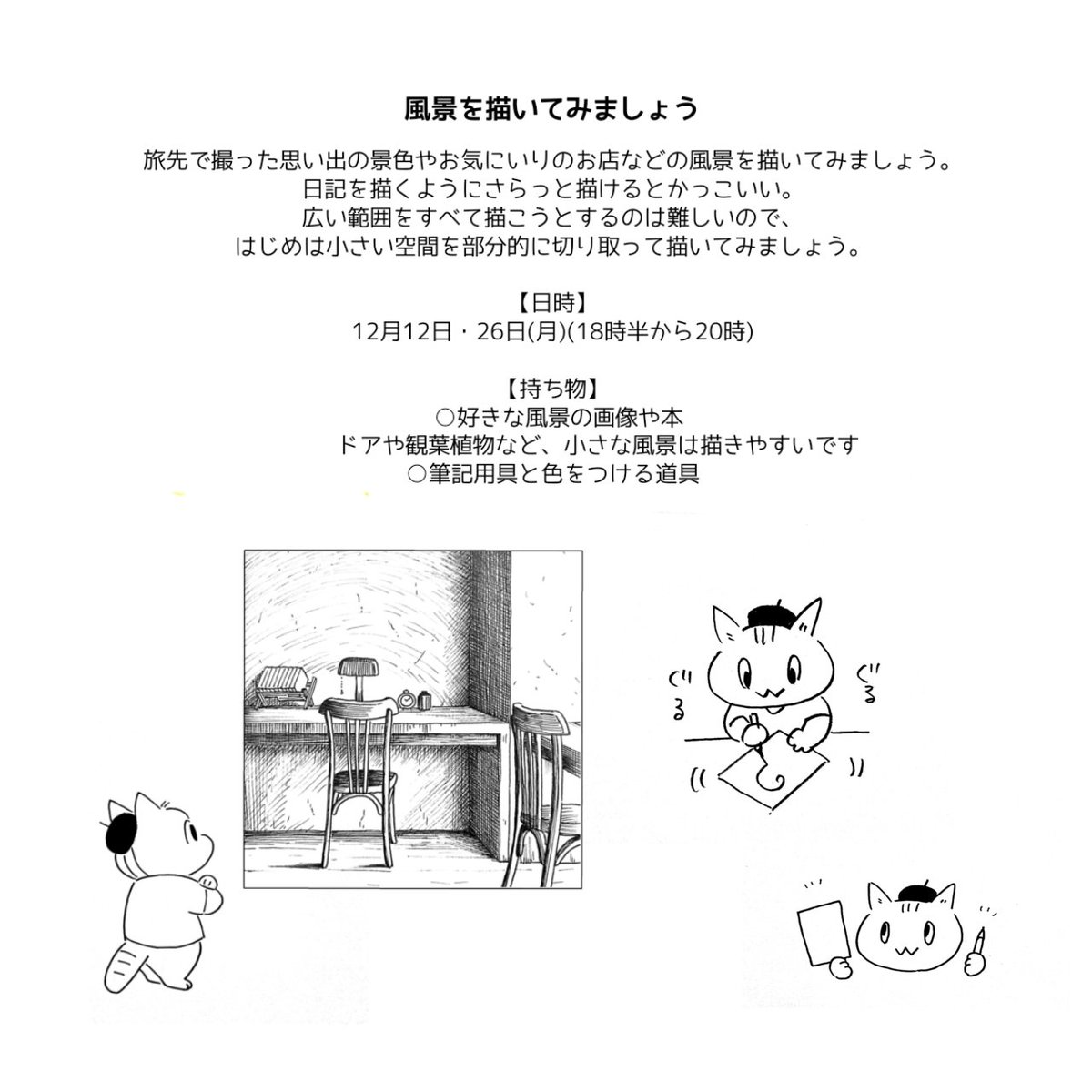 12月12・26日(月)18時半-20時開講の #アナログイラスト入門 のテーマは「風景」。広い範囲をすべて描こうとするのは難しいので、はじめは小さい空間を部分的に切り取って描いてみましょう。見学や体験も大歓迎。お問い合わせお申し込みはNHK文化センター札幌教室までお願い致します🪑 @nhkcul_sapporo