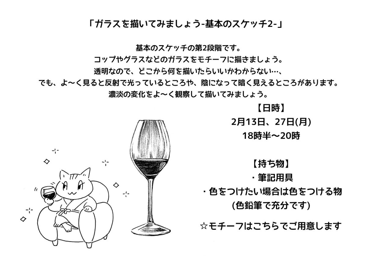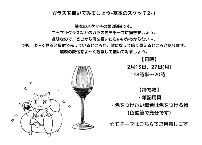 2月13日、27日の #アナログイラスト入門 のテーマは「ガラスを描く」。透明な物をどこから描いたらいいかわからない…等のお悩みを解消。簡単にいい感じに描けるコツをご説明します(画像2枚目はプリントの一部)。見学や体験のお申し込みはNHK文化センター札幌教室までお願い致します @nhkcul_sapporo