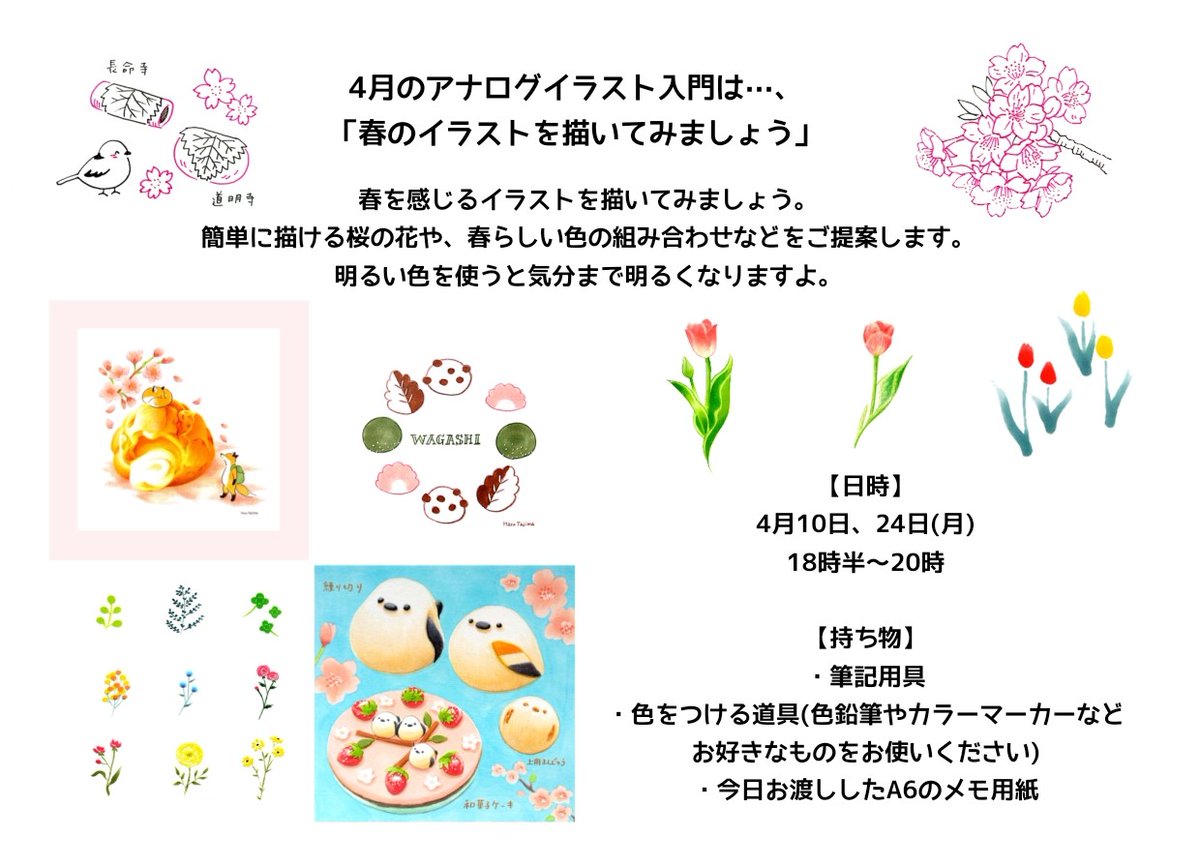 4月10・24日(月)18時半-20時はNHK文化センター札幌教室の #アナログイラスト入門 。テーマは春。春のモチーフの描き方や配色をご紹介。初めての方もいらっしゃるのでゆっくりやります。入会や体験いつでもお待ちしております。お申し込みお問い合わせは事務局までお願い致します🌸 @nhkcul_sapporo