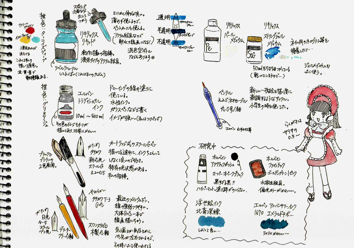 こちらの企画にも参加をば。 紙はアルシュ。時々ワトソン、アルビレオほか。筆はアルテージュとインターロンが多。ラクガキは呉竹の水筆:太(筆先単品求む)。水彩はシュミンケ。時々W&N、ヴァンゴッホほか大量。アクリルガッシュは昔からターナー一択。 #アナログ作家フェス #アナログ作家フェス_画材