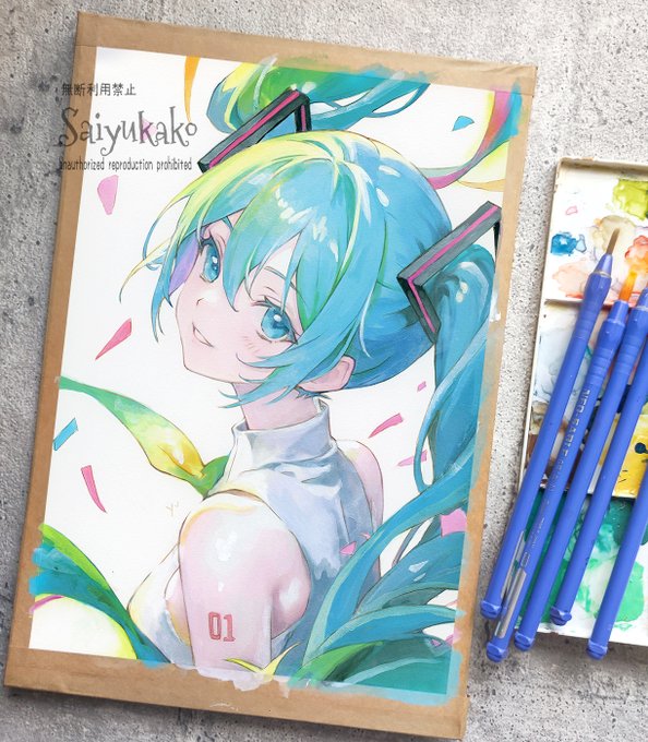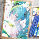 「初音ミク 笑顔〜プリズム」🍎おまけ #アナログ絵で魅せてみよ #初音ミク 4枚目 透明水彩、アクリル絵の具、ポスターカラー、色鉛筆 イラストは約B5 257mm×182mm 🌟デジカメで撮影したものです 少し暗めにうつってるので、先日のスキャナ取込のほうが原画に近いです twitter.com/saiyukako/stat…