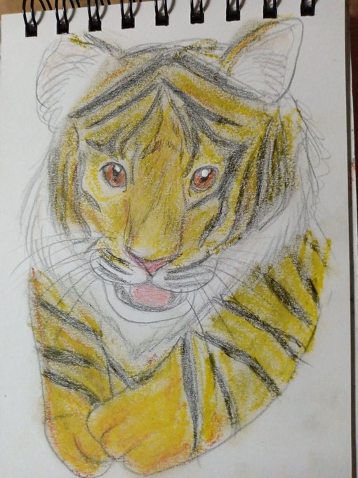 @roppisan @anobutaka @kamazoh おはようございます。創作パステル画 「(≡^・ω・^≡)ノ僕、たかあきくん!」 #オイルパステル #色鉛筆 #トラ #色んな猫を描いてみよう #アニマルキングダム #絵描きさんと繋がりたい
