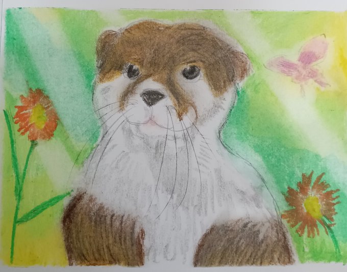 創作パステル画 「カワウソくん」 本日の一枚。 25分くらいで描けました。 #オイルパステル #色鉛筆 #カワウソ #アニマルキングダム #春 #絵描きさんと繋がりたい #みんなで楽しむTwitter展覧会