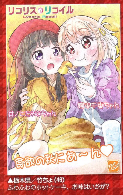 アニメ第9話のデートでおめかししたファッションを身にまとい、仲良くホットケーキを「あ~ん💞」して食欲の秋を満喫しているちさたきを、描きました~💛+。*(pq>ω<*)゚+。* #リコリコ #リコリス・リコイル #アニメージュ #絵描きさんと繋がりたい #私の絵柄が好みって人にフォローされたい