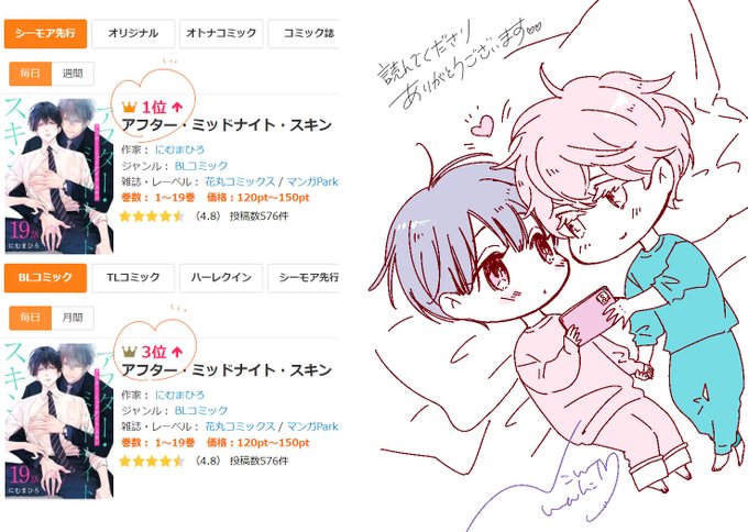 🧡コミックシーモアさんで #アフター・ミッドナイト・スキン 19話が先行BL1位👑BLコミック3位にランクインさせていただいてました! 読んでくださり本当にありがとうございます💛ご感想もレビューもめちゃくちゃ嬉しいです🦏🐯💕
