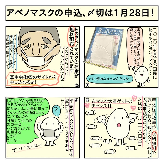 #アベノマスク の無料配布の〆切が迫っています。ほしい人は、申し込むといいですよ~。mhlw.go.jp/stf/seisakunit… #ライフハック #節約 #漫画 #マンガ #Web漫画 #コミック #comic #四コマ漫画 #4コマ漫画 #日常漫画 #漫画好きな人と繋がりたい #漫画好きと繋がりたい #漫画が読めるハッシュタグ