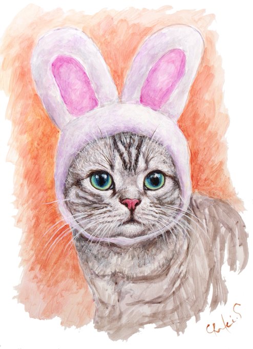 #猫絵 🐈🖼新作です “Bunny Ears Girl” (ケント紙にアクリル絵具、26.5x20cm) モデルは #アメショ の女の子😻 #年賀状イラスト #年賀状フリー素材 😅 #絵描きさんと繋がりたい #猫好きさんと繋がりたい #アナログ絵 #アクリル画