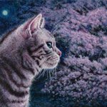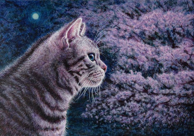 #猫絵 🐈🖼新作です “Yozakura”(アクリルデネブ紙の中目にアクリル絵具、29x20cm) モデルは #アメショ の男の子😻花と月と猫の瞳🌸美しさとその儚さをイメージ😅 #絵描きさんと繋がりたい #猫好きさんと繋がりたい #アナログ絵 #アクリル画 #桜