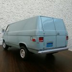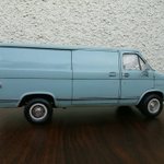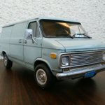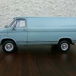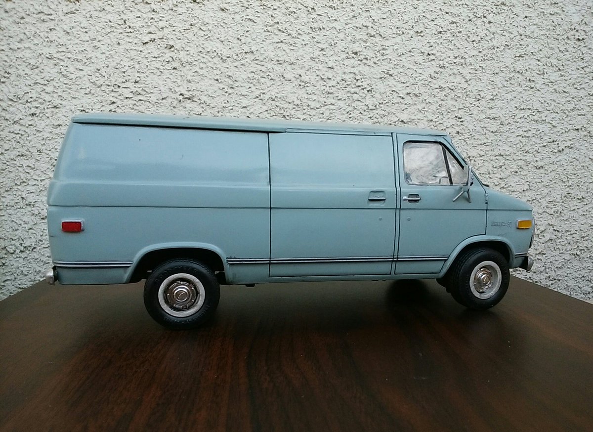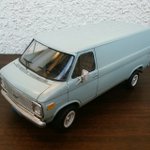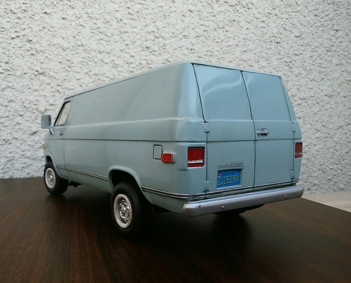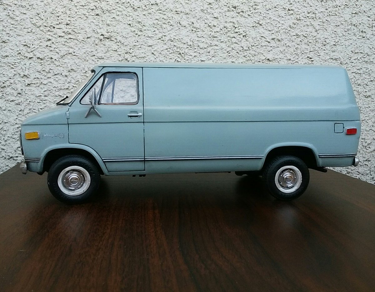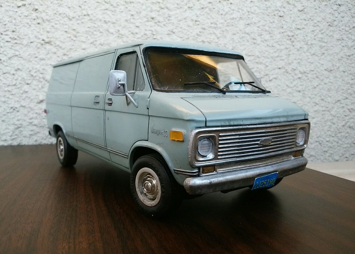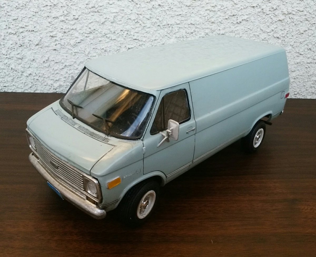 でけた。amt 1/25 シェビーバン。ヘッドライトのクリ抜き以外はキットのままです。塗装はタミヤの缶スプレー 『AS-5 ライトブルー(ドイツ空軍)』を塗布後に薄艶が出るまでコンパウンド磨き。ほんでスミ入れ黒でライン出し&汚し。パン屋のおばさんみたいな顔だけどカッコユー! #アメリカンカープラモ