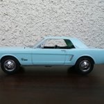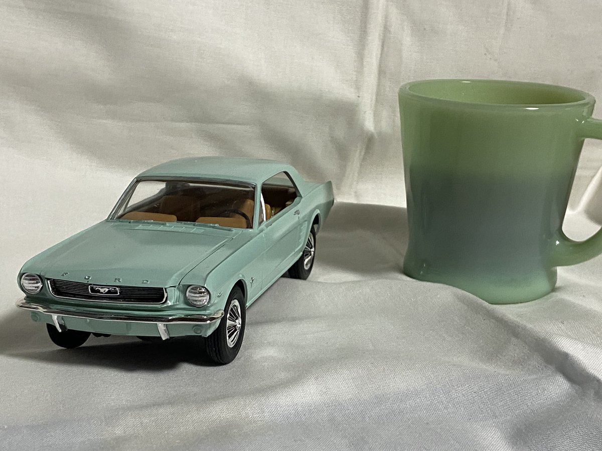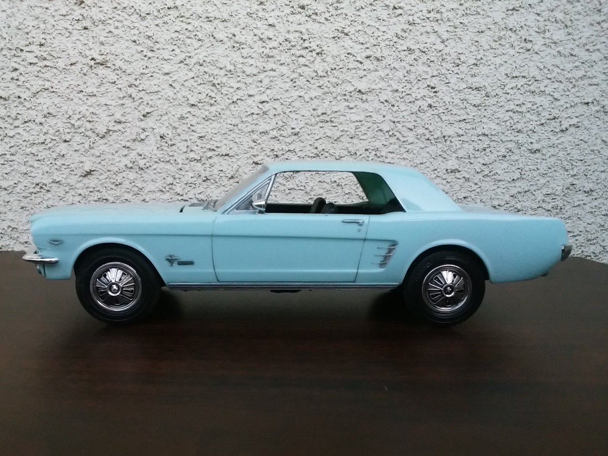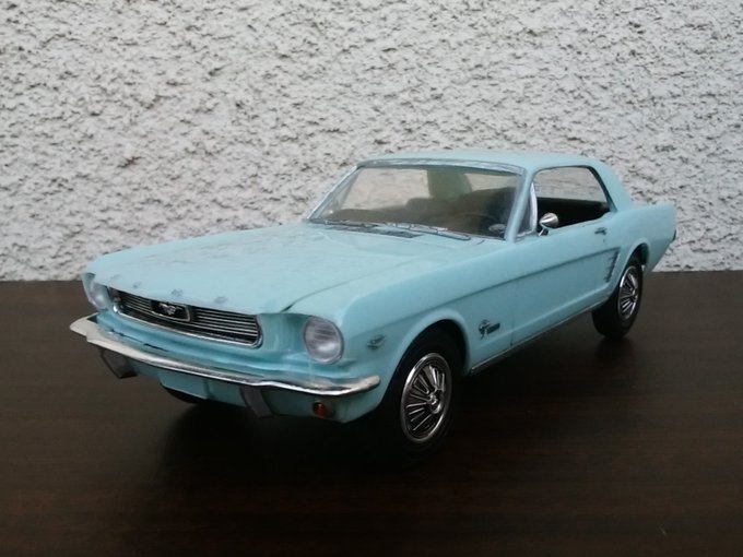 66 mustang ベランダ撮影。#アメリカンカープラモ ◆amt(ERTL) 1/25◆未塗装成型色仕上げ◆窓枠・モール・エンブレムなどは息止め筆塗り法◆各部にスミ入れブラック◆コンパウンド磨き後に軽く一発水性クリア◆ヘッドライトはクリアパーツ&アルミ挽き物カップへ変更