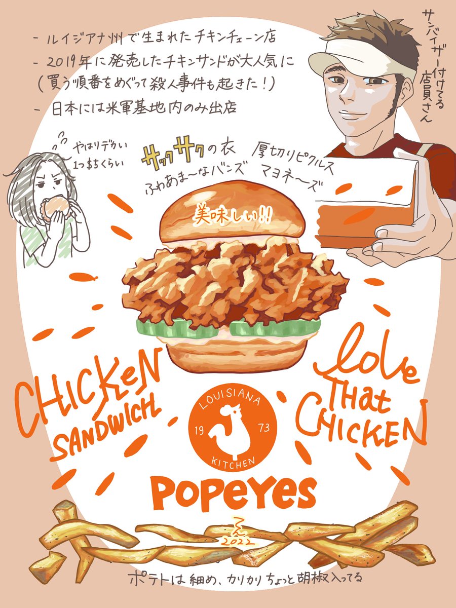 調子に乗って、お店紹介第二弾。 ファーストフード店といえばIn-N-Out Burgerが有名なのですが(カリフォルニア発祥だし)、私の周りではpopeyesが人気。米軍基地にはあるらしいので、入る機会があればぜひ。 #イラスト #illustration #アメリカ