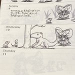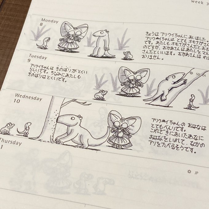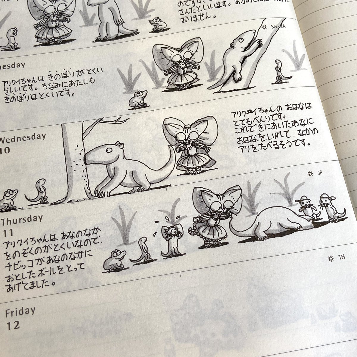 先週分の「ミーシャちゃんの日記」 ミーシャちゃんと アリクイちゃん #アリクイ #猫 #猫イラスト #絵 #イラスト #絵描きさんと繋がりたい #イラスト好きな人と繋がりたい #モレスキン #手帳 #ミーシャちゃんの日記