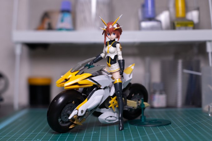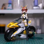 金潟 すぐみ&専用バイク(通称:金潟バイク) 完成しました‼︎ 前作のシタラちゃんのバイク同様に専用ギアのパーツを使ってバイクを製作しました。 #アリスギアアイギス #メガミデバイス #金潟すぐみ #アリスギアバイク部