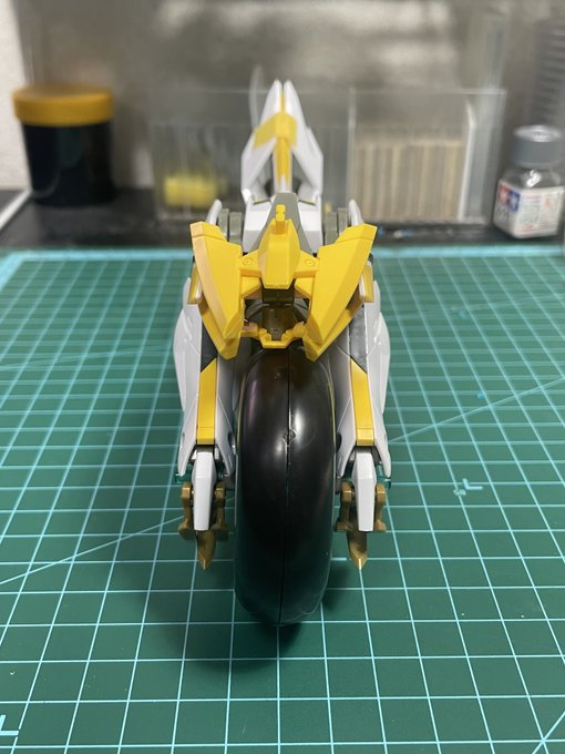 これは勝ちへのルート見えてきたな。 ラムエアダクト、片持ちソードスイングアーム、下出しショートバレルマフラー、ショートスポーツテール… まだまだ性癖詰め込んで行くぜ。 #ブキヤバイク #アリスギアバイク部 #メガミデバイス