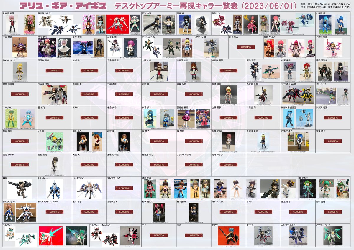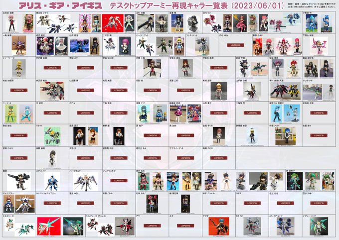 今年のDTAカスタムコンテストも引き続きアリスギア部門開催とのことで、DTA再現キャラ一覧を更新しました。 ご参考になりましたら幸いです。 あお・武希子プレイアブル化で枠がめちゃめちゃ(訴求的に)増えました。 #デスクトップアーミー #アリスギア #アリスギア造形部