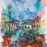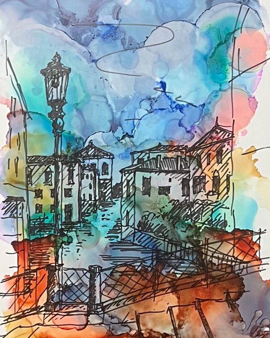 『ヴェネツィアにて』 初めて #アルコールインクアート に挑戦してみました と言っても、アルコールインクアートはふつう偶然的なインクの流れを楽しむ抽象画ですけど、私の場合その上から風景を描いて具象画にしてしまいました😅 私、抽象画を描けないのです笑