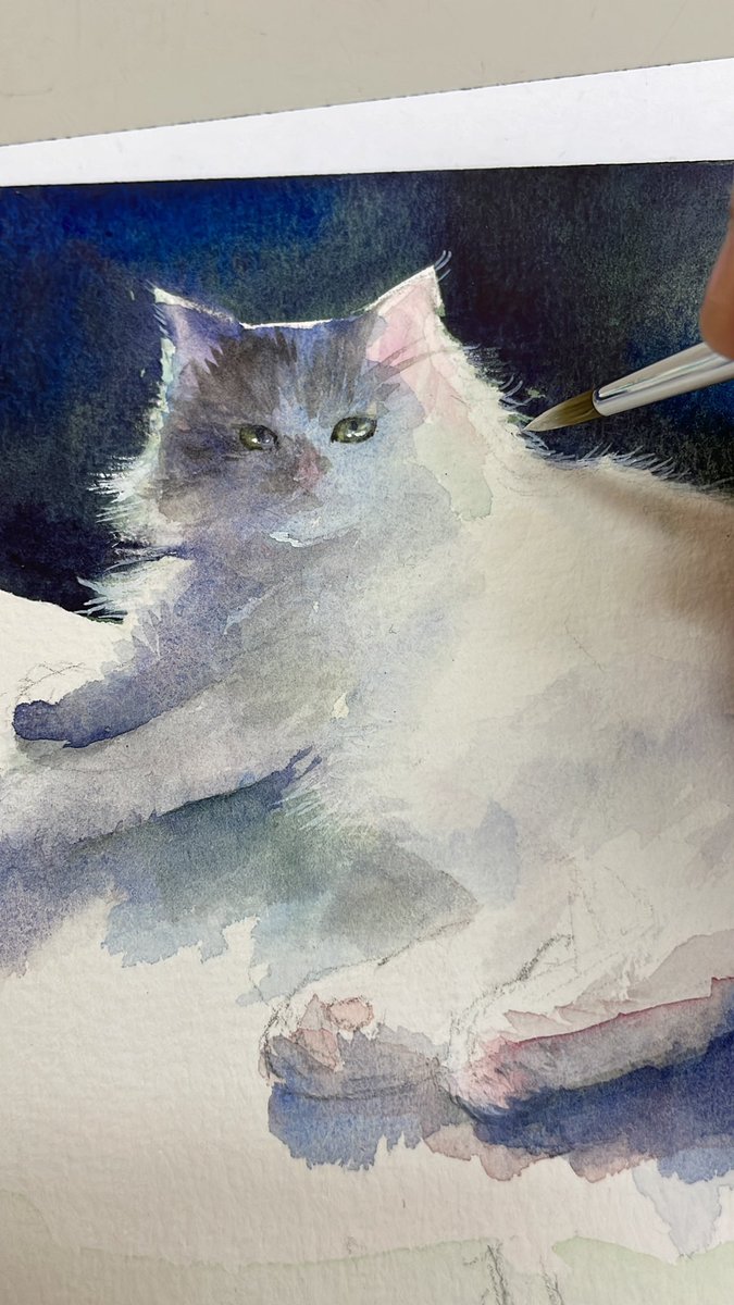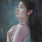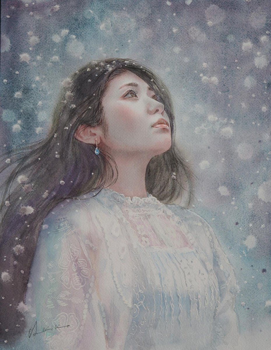 #暑いので涼しげな画像を貼る 過去作ですが F 6「初雪」(個人蔵) 雪が降る頃の冷たさが想像も出来ない🥹 寒い…ってどんな感覚だったかと思い出せない🥹 #人物画 #美人画 #水彩 #絵描きさんと繋がりたい #水彩画 #透明水彩 #アルシュ