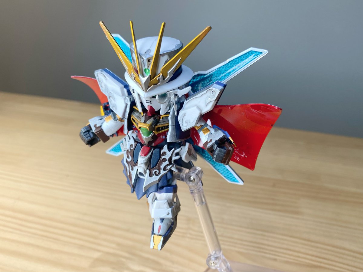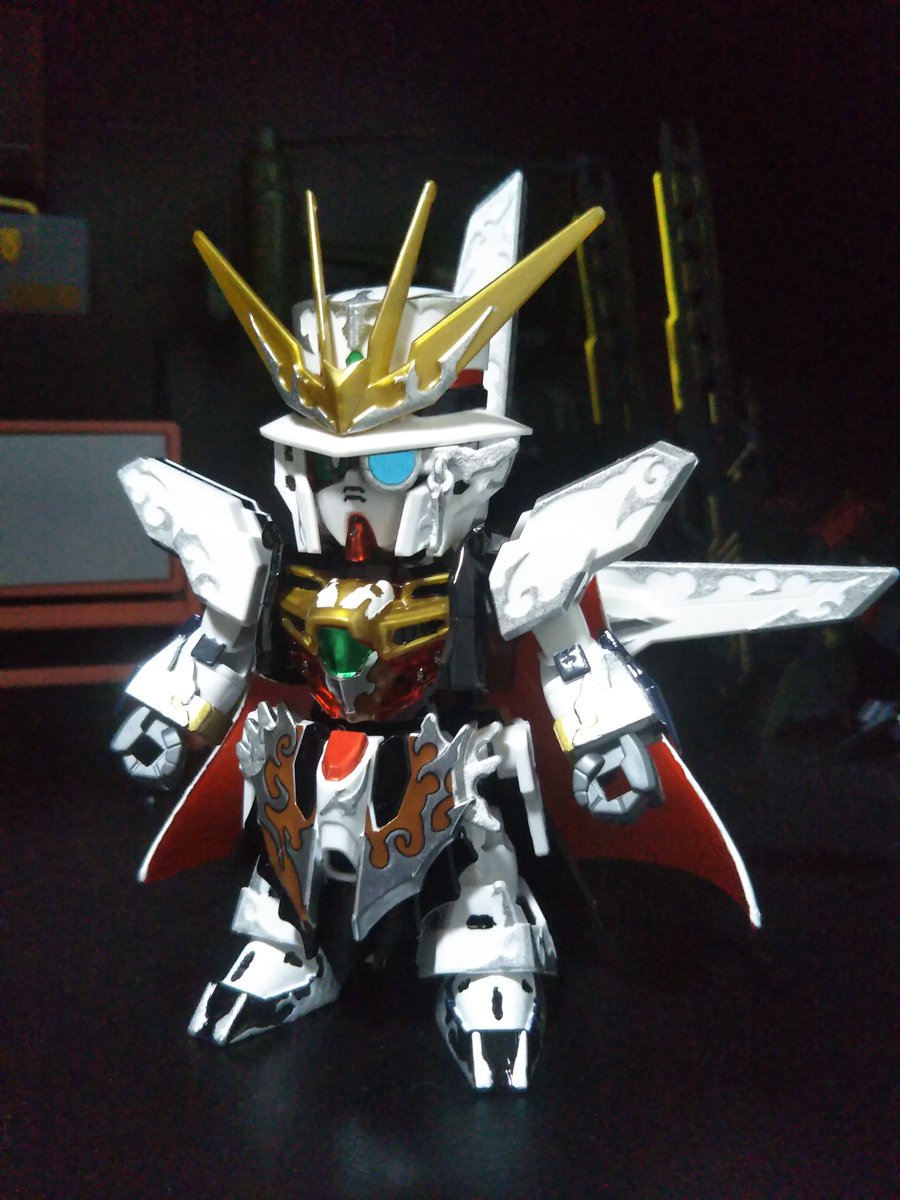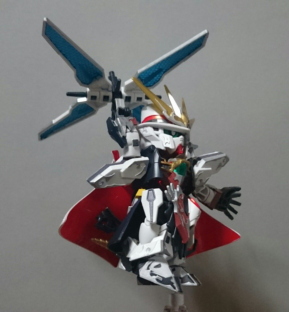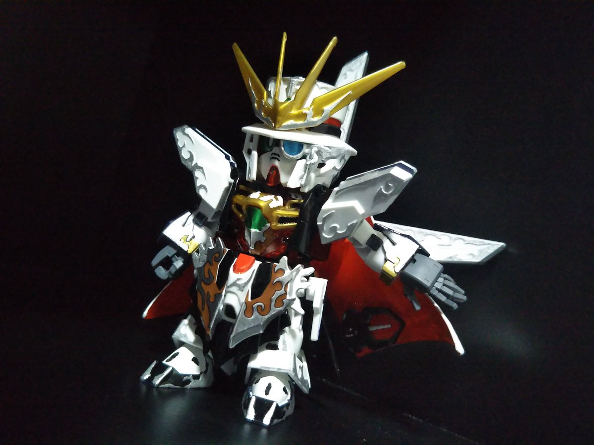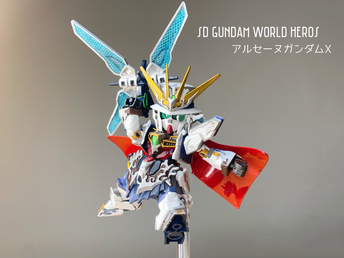 #アルセーヌガンダムX 完成~! 平手がよく似合う! モノクルがクリアパーツじゃなかったり、赤がクリアパーツなのには驚いたけど、マントは白で塗ったら、裏側のレッドが明るく見えて大分いい感じに(なお労力:大) (リプ続) #ガンプラ #SDGW #ガンプラ好きと繋がりたい