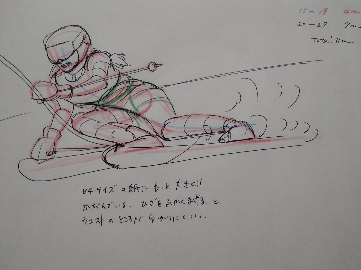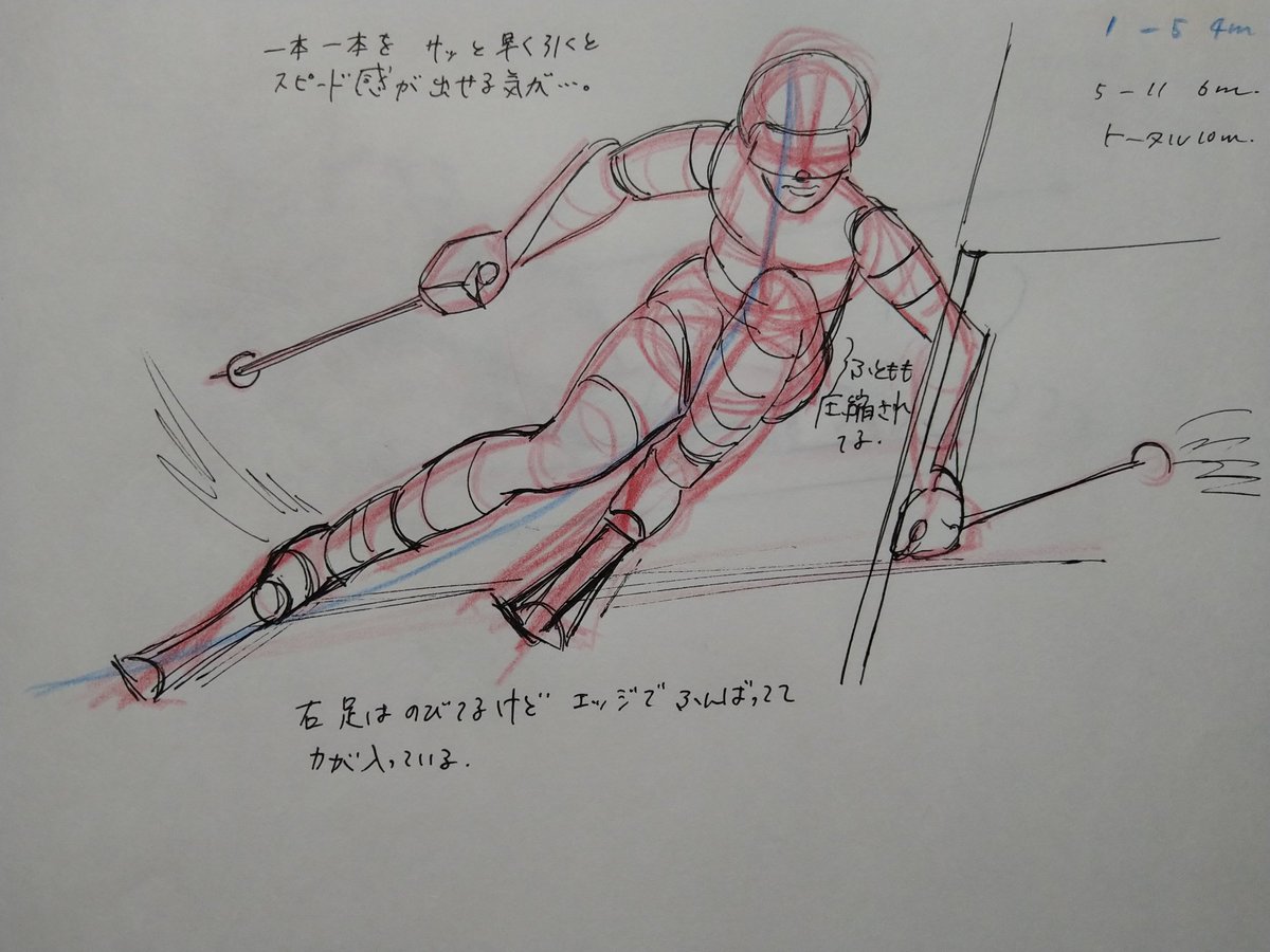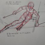 続『アルペンスキー』 カラー部分が4分。ペン書き好きなので長めに🥰 紙に大きく描くことに気をつけて…接地面を赤で強く。 骨盤の向きが難しい… #スケッチ #クロッキー #アルペンスキー #お絵描き好きさんと繋がりたい #イラスト好きさんと繋がりたい #アトリエの系譜
