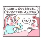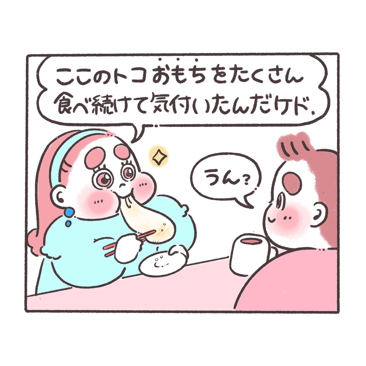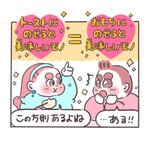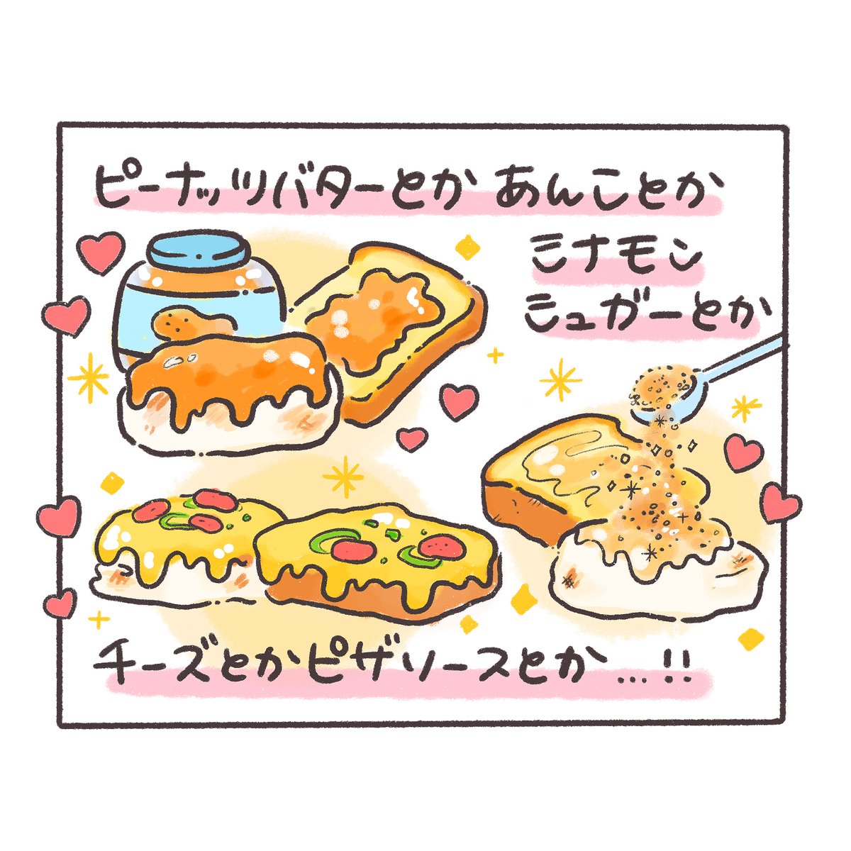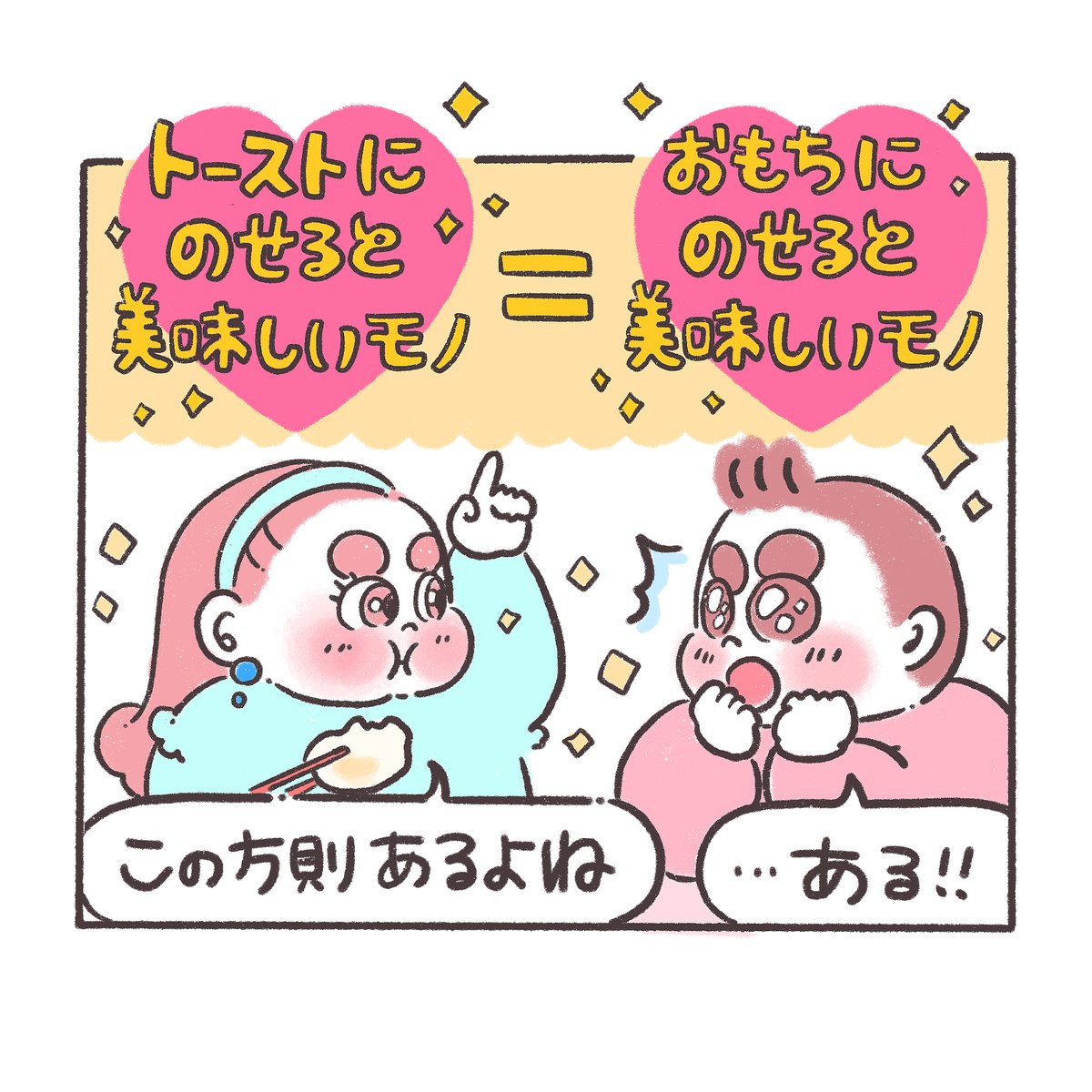 お餅とトーストの方程式 🍩「どっちもパリッと香ばしいもんね💡」 #ぽちゃ日和 #イラスト好きな人と繋がりたい #絵描きさんと繋がりたい #絵柄が好みって人にフォローされたい #3コマ #食べ物イラスト #餅 #パン #トッピング #アレンジレシピ