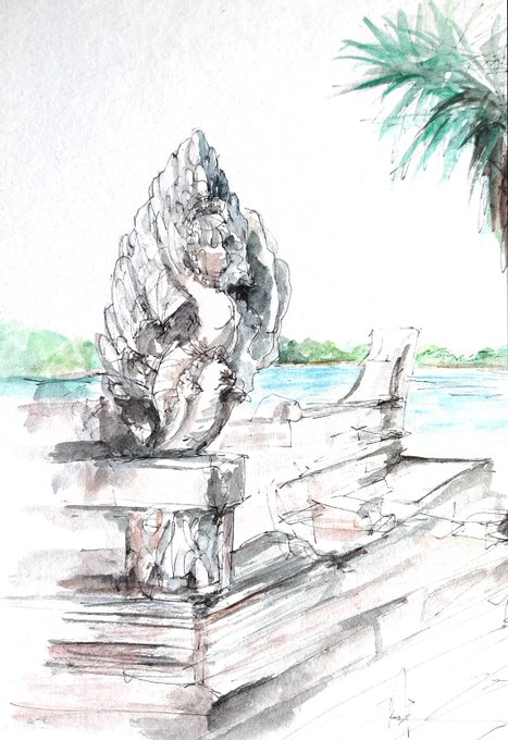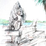 #りえこさん冒険の思い出 その582 カンボジアはアンコールワット。水辺にある遺跡は女神らしき像が多い,。印象深いのは大蛇に乗っている女神。それとも大蛇が女神〜かな? #絵 #旅 #水彩画 #スケッチ #watercolor #カンボジア #アンコールワット minne.com/@ritakahashi4