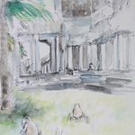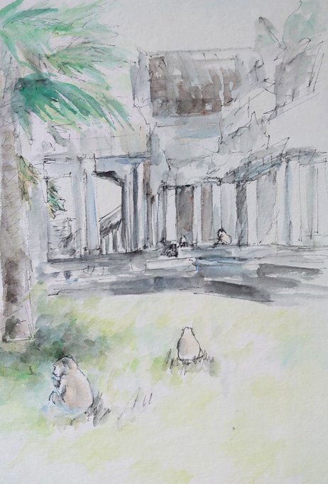 #りえこさん冒険の思い出 その586 カンボジア。アンコールワットの入口は毎朝通っていたが、毎日模様が違うようで楽しい。なんと猿がたくさん見れる時もある〜かな? #絵 #旅 #水彩画 #スケッチ #watercolor #カンボジア #アンコールワット minne.com/@ritakahashi4