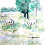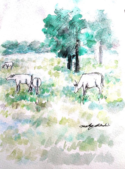 #りえこさん冒険の思い出 その589 カンボジア。宿からアンコールワットまでは、自転車で20分〜30分。牛もいるような、のどかな田園風景を過ぎると、遺跡が見えて来る。その道中も楽しい〜かな? #絵 #旅 #水彩画 #スケッチ #watercolor #カンボジア #アンコールワット minne.com/@ritakahashi4