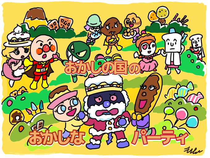 #アンパンマン版深夜のお絵かき60分一本勝負 お題「お菓子」 APミュージカル「おかしの国のおかしなパーティ」を思い出しつつ描いてみました。この時は笑える話にしたくてエクレアさんとプリンちゃんがばいきんまんを振り回す展開をやたら盛り込みました。変なしょくぱんまんの正体ははみがきまんです