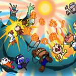 #アンパンマン版深夜のお絵かき60分一本勝負 お題「太陽」 またもミュージカルからで恐縮ですが、黄金の炎のラストシーンです。コロッケとクリームの守った炎のカケラから黄金の炎が復活。最後は太陽の光を浴びたアンパンたちのトリプルパンチで大逆転!今年の巡回作品なのでお近くに来たらぜひ!