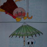 #アンパンマン版深夜のお絵かき60分一本勝負 今回のお題「傘」☂ オカリナ姫初回や、ひみつの宝箱に、出てきた。開くと雨が降る傘。 ばいきんまんとバイキン仙人は、同じような傘を、作っている他。 両耳がない。猫型ロボットも、この傘を、持っていた。(←↑よその作品)