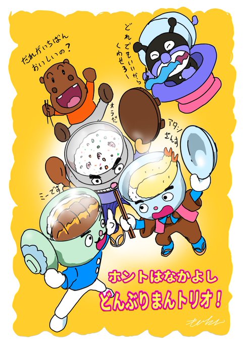 #アンパンマン版深夜のお絵かき60分一本勝負 お題「どんぶりまんトリオ」 あれ、ちょっと前にこのお題あったじゃん?と思ったら5月は「どんぶりキャラ」だったのです。でその時もどんぶりまんトリオ描いてたので。。似てる感じになっちゃいましたがご勘弁を。