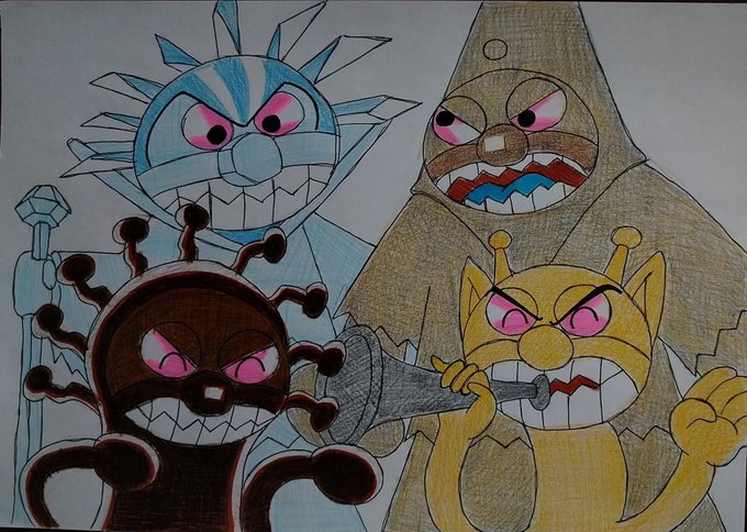 #アンパンマン版深夜のお絵かき60分一本勝負 今回のお題「悪役」 ドロリンの映画では、まっくろマントを、手に入れた。ばいきんまんは、自分以外の悪役キャラとして。 バイキン氷の女王 バイキンすなおとこ バイキン化石の魔王 バイキンどろんこ魔王に、変身した。