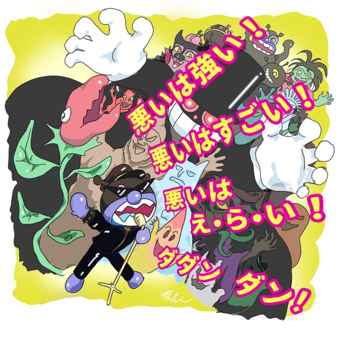 #アンパンマン版深夜のお絵かき60分一本勝負 お題「悪役」 大遅刻ですみません。GW中から超多忙でやっと手を動かせました。 APミュージカル「勇気の花に歌おう」後半でばいきんまんがステージ上で「♪悪いはすてき」を熱唱しておばけ花を復活させるシーンをイメージして描きました。これも名曲です👍