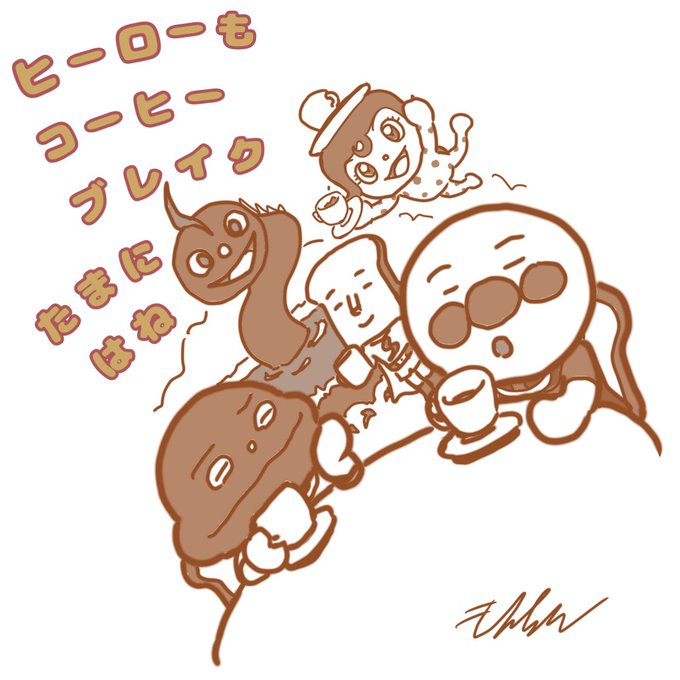 #アンパンマン版深夜のお絵かき60分一本勝負 2023年度の「コーヒー」お題(☕) コーヒーパンマンも。「ホットアンパンマン」と「ホットサンドアンパンマン」のように。名前を変えて再登場するとしたら。「コーヒーアンパンマン」とかになりそう。 コーヒーパンマンの顔に。服とマントは通常カラー。