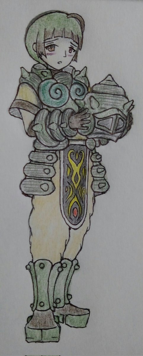 #イラスト #アークリオネ サザイン・ツーボヤッキ モチーフ:サザエ ○海魔人サザインの本来の姿。臆病で自分に自身が持てない性格。 ○普段から防具を身につけ見栄を張っている。ちなみに、ヘルメットを被っているのは顔を見せるのが恥ずかしいから。(女の子に間違えられるらしい。) twitter.com/Akinari4447101…