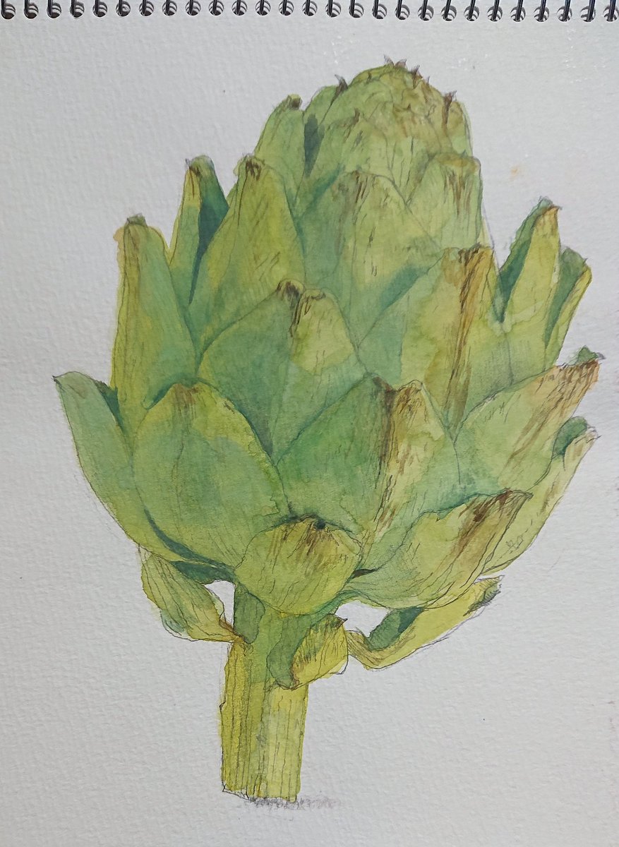 こんにちは✨WANOEです☆ アーティチョーク【オニアザミ】(水彩画) F 0号 スケッチブック 画用紙・鉛筆・不透明水彩 2016制作 食用なんですよ🎵 でも実はまだ食べたことないです☆ 花が咲いたら綺麗だろうな〜☆ #絵描きさんと繋がりたい #アーティチョーク #水彩画 #watercolorpainting