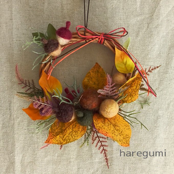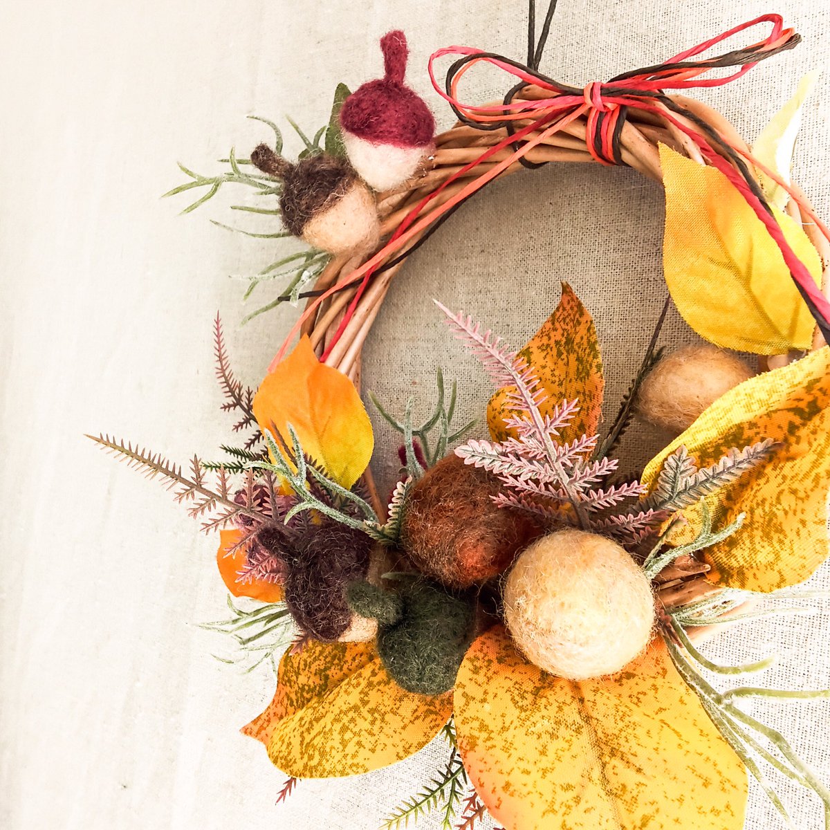 羊毛フェルトのどんぐりときのこを秋のリースに仕上げました🍂 ほっこりと柔らかな羊毛フェルト素材が優しい秋にぴったりです minne.com/@hare-gumi #minne #minne_new #羊毛フェルト #アーティフィシャルフラワー #秋 #リース #どんぐり #きのこ #雑貨