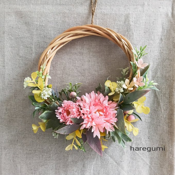 優しくてかわいいリースも作りたくなったので( ˘͈ ᵕ ˘͈ ) ピンクとイエローのダリアをメインにパステルカラーのリースで、気分を上げていきましょう🎶 #minne_new #minne #アーティフィシャルフラワー #リース #造花 #ハンドメイド #羊毛フェルト minne.com/@hare-gumi