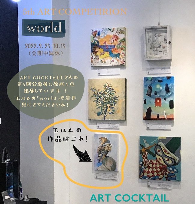 会場写真いただきました! 奥の壁のここにエルムの作品がありますʕ•ᴥ•ʔ 是非生で見てください! 現地では好きな作品に投票する企画もあります! オンラインでの投票も間も無くなので要チェック! #絵描きさんと繋がりたい #創作クラスタさんと繋がりたい #第5回公募展 #アートカクテル twitter.com/art_cocktail/s…